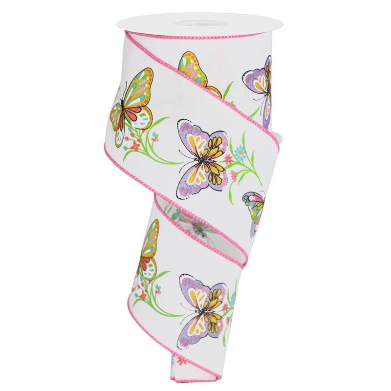 White linen ribbon withpastel colored butterflies and delicate flowers. Measures 2.5" x 10YDs, wired. Great for Spring and Summer accents!