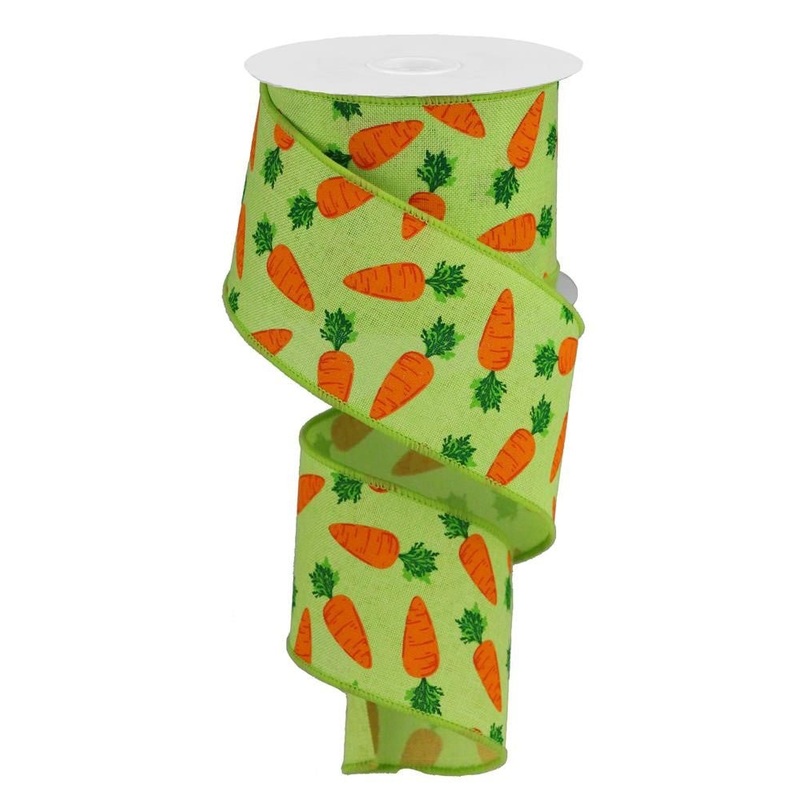 A roll of 2.5" wide, lime green linen ribbon with small orange carrots. This wired ribbon is perfect for fun Easter accents, and the wired edges make it perfect for shaping into bows. 10 yard length.