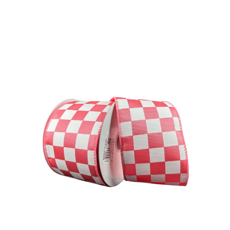 A 2.5" x 10yd roll ribbed satin ribbon with coral and white check pattern. Wired. Great for Spring and Summer projects!