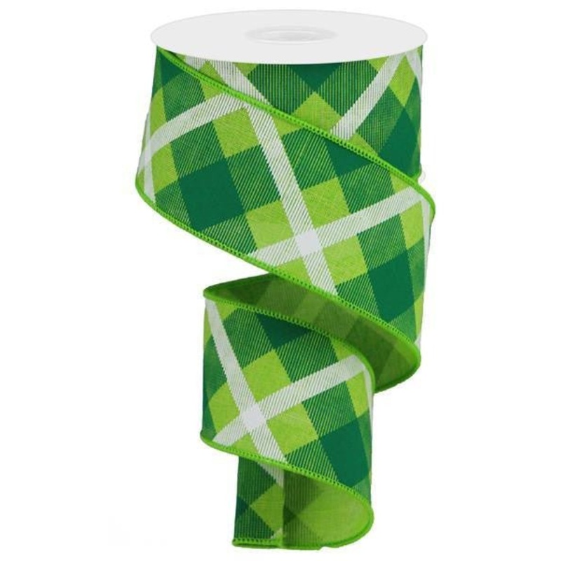 A roll of lime green linen ribbon with a diagonal plaid pattern in emerald green and white. Wired edges. 2.5" x 10YDs. Great St. Patrick's Day accent! Wired edges make this ribbon perfect for shaping into bows to add to wreaths, garlands, tying up packages