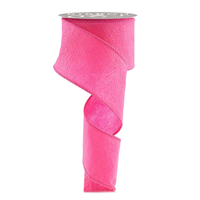 Hot Pink ribbon with a floral pattern embossed into it.This ribbon is thinner yet nice and sturdy and is semi-transparent in the places where the lines of the embossment press into the ribbon. Almost like a thin plastic ribbon. 2.5″ x 10 yards, wired.