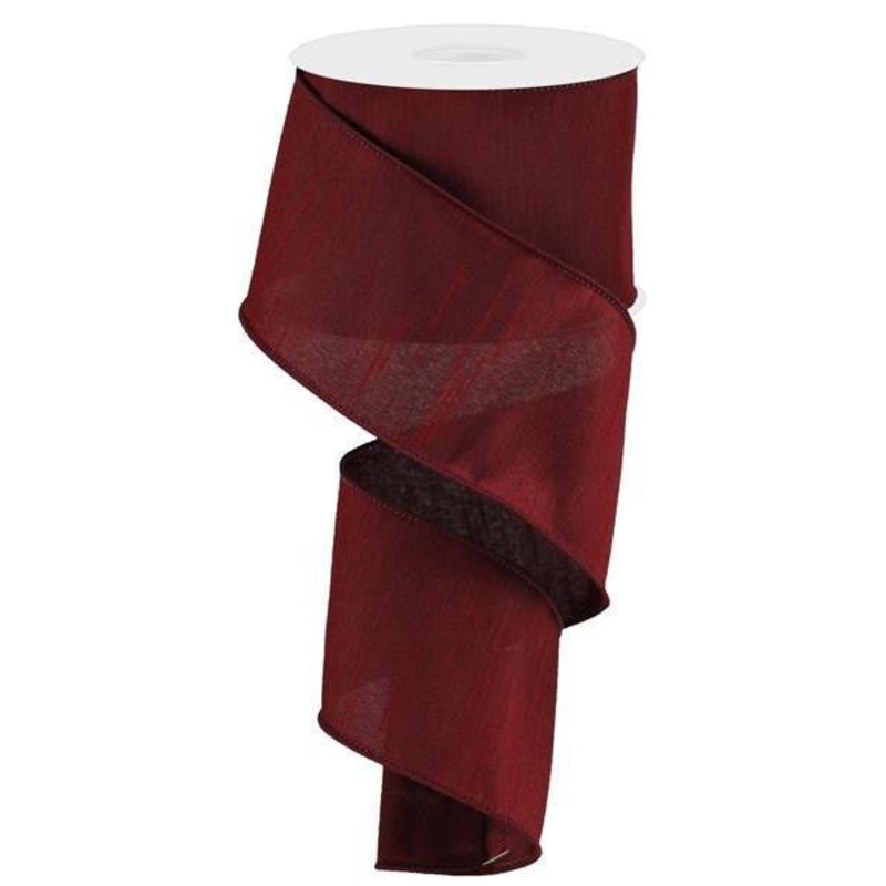 A roll of wired burgundy faux dupioni ribbon. 2.5" x 10yds. Use to make wreaths, bows, for gift wrapping, or decorate your tree or mantle! 100% polyester. Faux dupioni is a high quality ribbon resembling rough silk fabric with a slightly lustrous hue. This