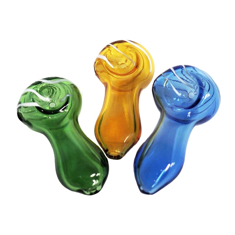 Glass Spoon Pipe Size:2.5" Assorted Colors with White Swirl Design Sold as Singles SKU:TP-GP-GP1622AST *If you need a detailed inventory needed, please call your sales representative