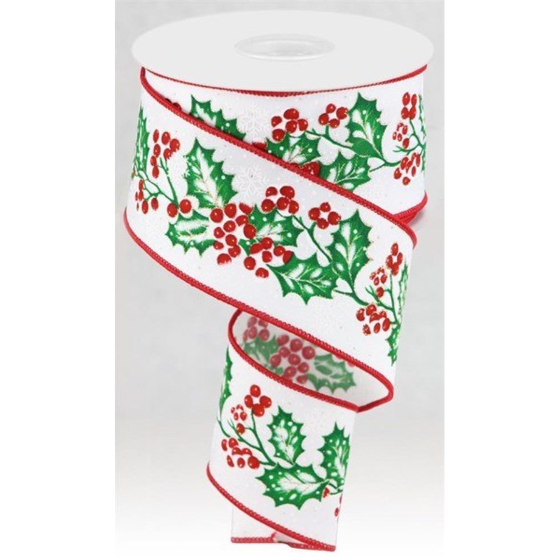 A roll of wired white linen ribbon with holly branches with red berries with white snowflakes. Wired edges. 2.5" x 10yds. Use to accent Christmas wreaths, bows, for gift wrapping, or decorate your tree or mantle!