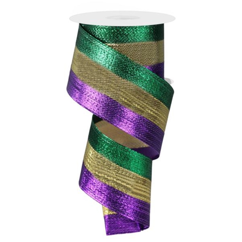 A roll of metallic purple, green, and gold triple striped wired Mardi Gras ribbon. 2.5" x 10YDs. Perfect for finishing off your Mardi Gras Decor!