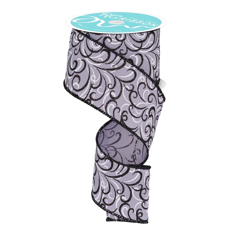Grey linen ribbon with swirls in white and glittery black. 2.5" x 10 yard length, wired. Great print for Halloween wreaths, bow, and decor!