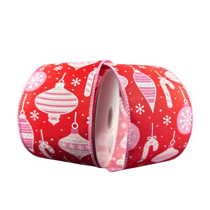 Red satin ribbon with pink and white Christmas ornaments. 2.5" x 10YDs, wired. Use to decorate Christmas wreaths, trees, garland, or tie up pretty packages!
