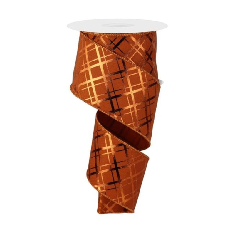 Deep orange Autumn colored diagonal weave (fine weave) ribbon with thick and thin metallic copper diagonal check lines. 2.5″ x 10yds, Wired. Great ribbon for fall bows and decor.