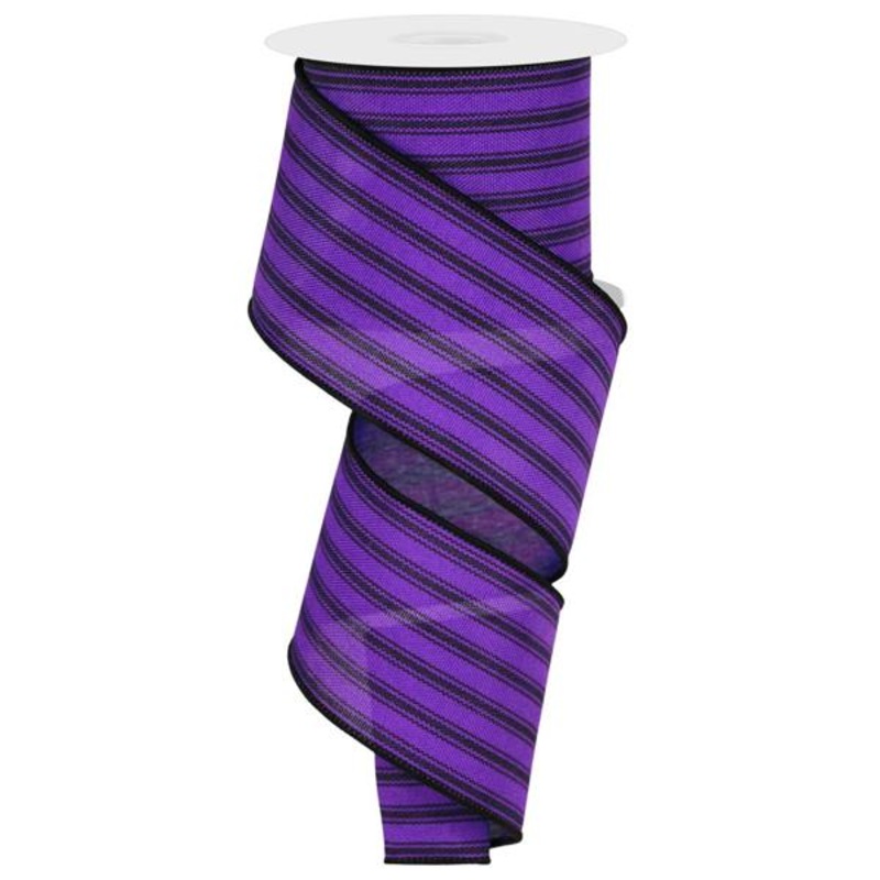 A roll of wired purple colored cotton/polyester ribbon with black ticking stripes and black edging. 2.5" x 10YDs. Wired edges makes it great for shaping into bows.