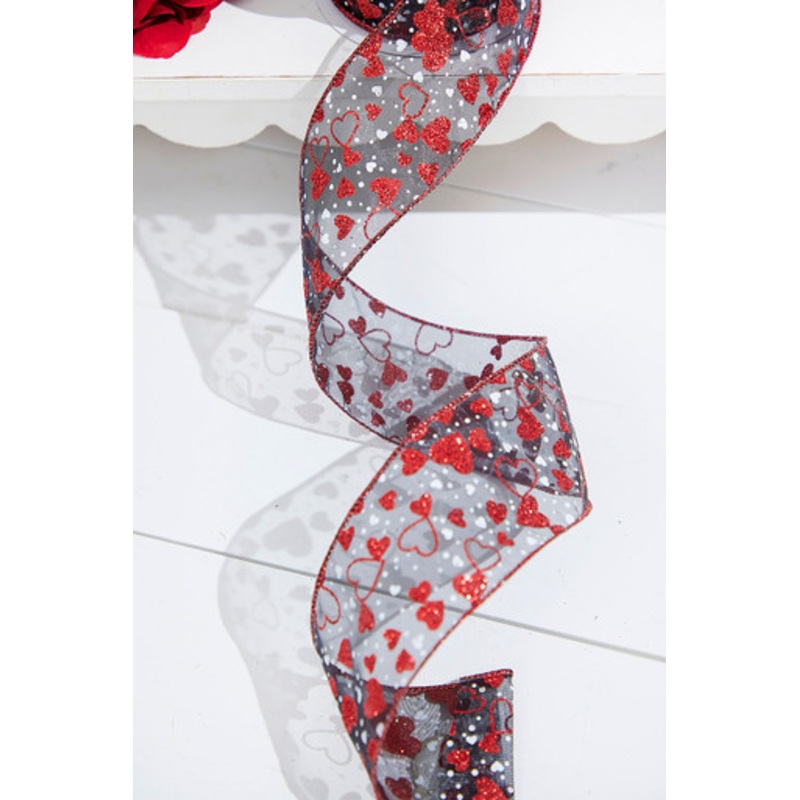 Add a touch of sparkle to your Valentine's Day crafts and more with our 2.5" x 10 Yards Red Glitter Heart Sheer Black Ribbon. Featuring a sheer black fabric adorned with vibrant red glitter hearts, this wired ribbon is perfect for creating romantic bows, f