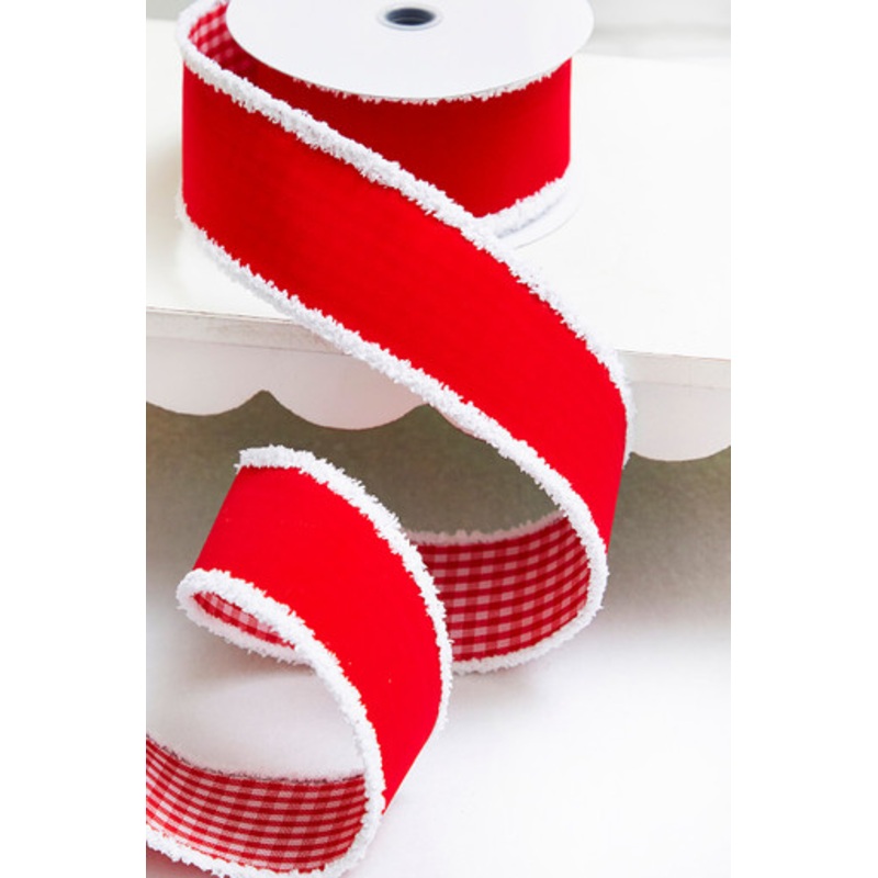 This cute red ribbon with check backing is the perfect accent ribbon for your Christmas trees, packages, and other holiday decor! Bring the whimsical to rustic looks to life with this versatile and fun pattern. The double sided pattern allows for versatility in usage – choose from red velvet with furry white edging, red and white gingham print or pair both in your design!