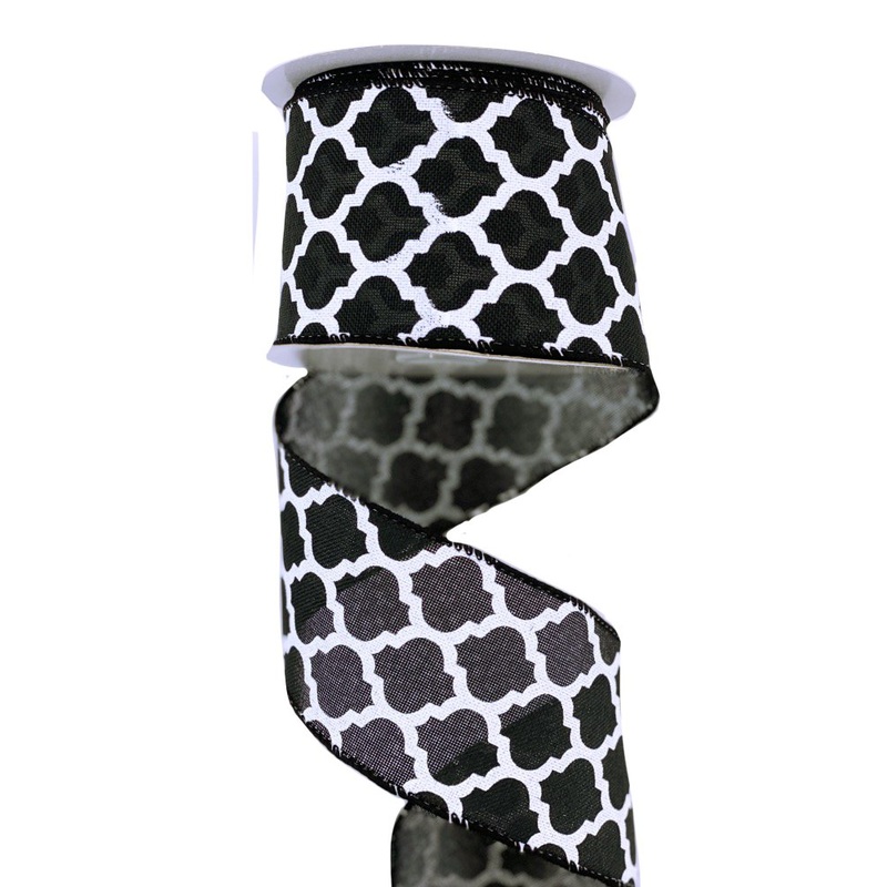 A roll of black canvas type ribbon with white quatrefoil/lattice print, wired. 2.5" x 10YDs. Great anytime accent! Very versatile!