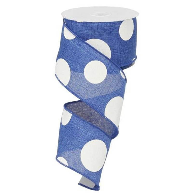 A roll of royal blue colored linen ribbon with giant white polka dots, wired. 2.5" x 10YDs. Great for patriotic or team color accents! Very versatile!