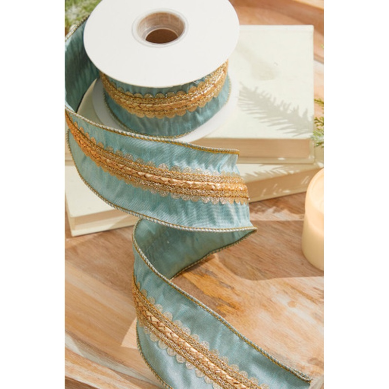 This Scalloped Braid Dupion Ribbon is perfect for your smaller glam holiday projects. With delicate aqua and gold detail on the wired edging as well as the center lace and braid pattern, this high-quality ribbon brings a fresh luxe look to any garland, wre