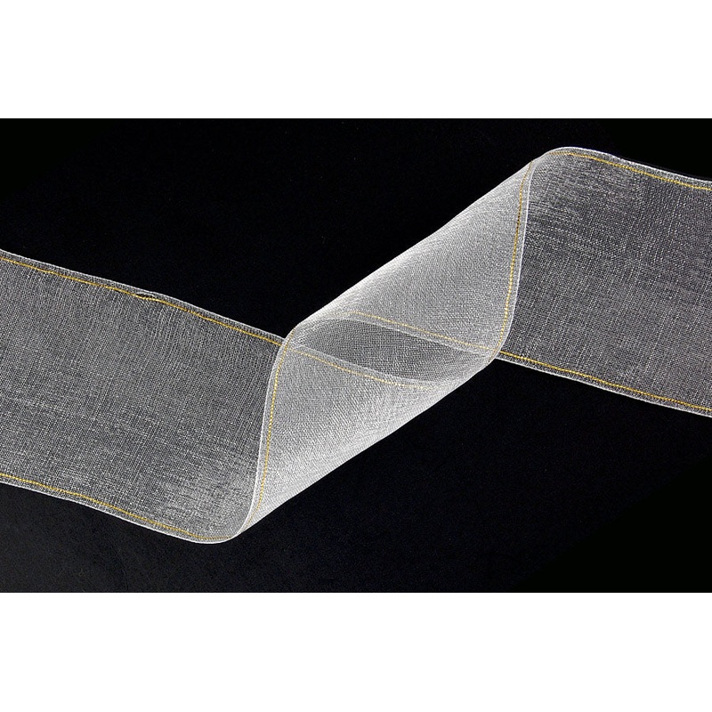2" wide white sheer ribbon, with thin metallic gold edges. This elegant sheer ribbon is made of an airy and drapable sheer organdy. 100% Nylon.
