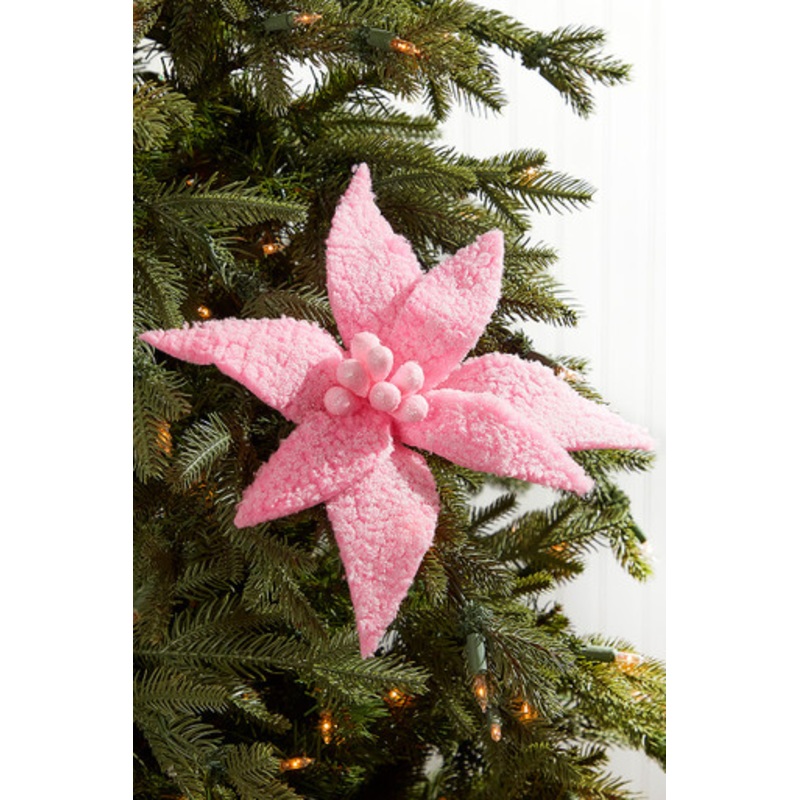 A favorite for its brightening effect, our cotton candy stem welcomes the sweetness of the holiday season into your home. The thick, textured petals have a delicate, sugary coating, brought together by a beaded center. Blend this hot pink poinsettias for Christmas tree into any whimsical theme with white ribbon and peppermint swirl ornaments and sprays.
