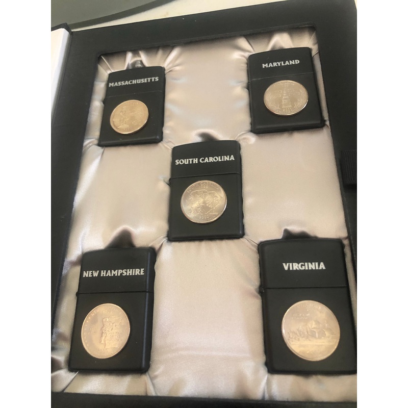 2000 Zippo Quarter Set Volume #2 - All Mint This Millennial quarter set includes 5 Zippos with state quarters affixed. Massachusetts, Maryland, South Carolina, New Hampshire and Virginia included. Great limited set that is now over 20 years old. The lighte