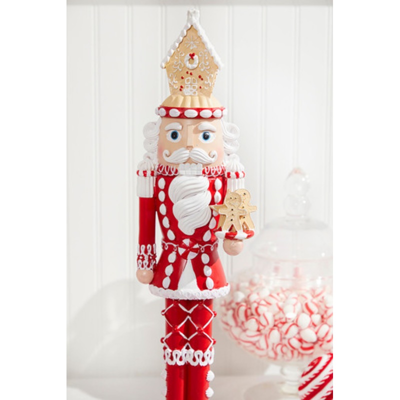 Bring a bit of gingerbread magic to your holiday home with this 21.5" Gingerbread House Nutcracker. Standing tall in a bold red and white color scheme, this festive nutcracker sports a deliciously sweet gingerbread house on his hat and holds a delightful p