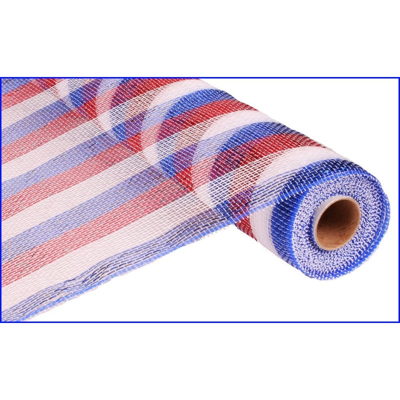 21" X 10YD Red White and Blue Striped Metallic Deco Mesh. Great for Patriotic Wreaths and Decor! Use to make deco mesh wreaths and garland, decorate your tree or mantle, wrap gifts, make bows, etc!