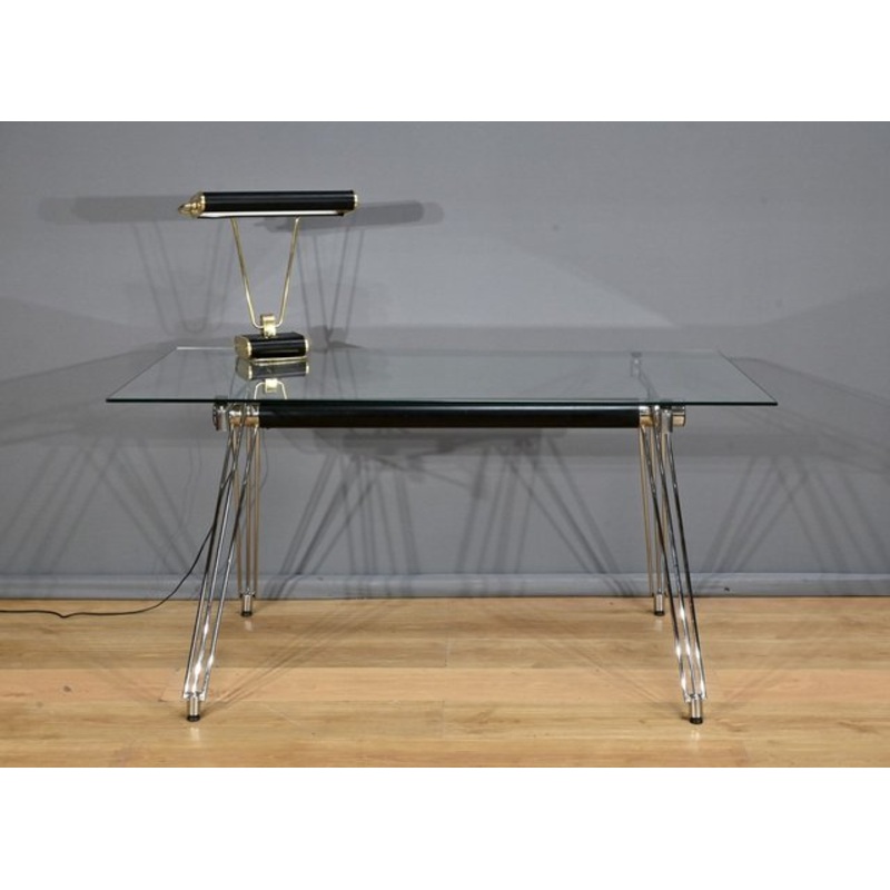 This glass office table, designed by Pete Polar for Kare Design, is a modern and stylish piece for the 21st century.The rectangular transparent glass top rests on chrome-plated metal legs, inclined and connected by crossbars.This structure ensures optimal
