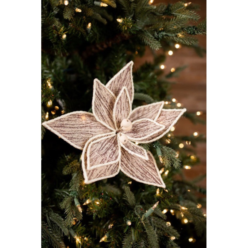 Featured in our Woodlands theme, the raw, faux wood appearance will give any tree or garland a rustic feel. Each petal is lined with a simple rope cord that adds dimension along with the white berries in the center. Use these stems to add a unique texture to your metal accent pieces, neutral ribbon, and wooden ornaments.