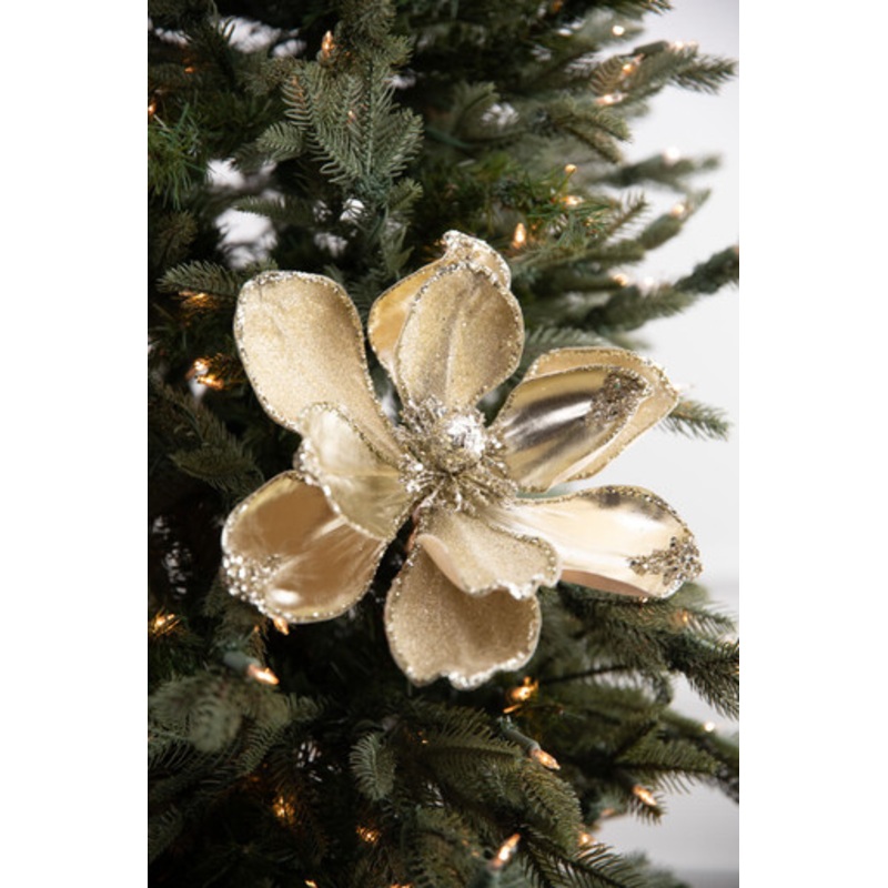 Indulge in extravagant elegance with our 22 Champagne Magnolia Stem. Its champagne petals generously dusted with glitter and frost, embodies glamour and sophistication. This opulent centerpiece breathes new life into your white and gold Christmas decor, inspiring a sense of warmth and glamour.