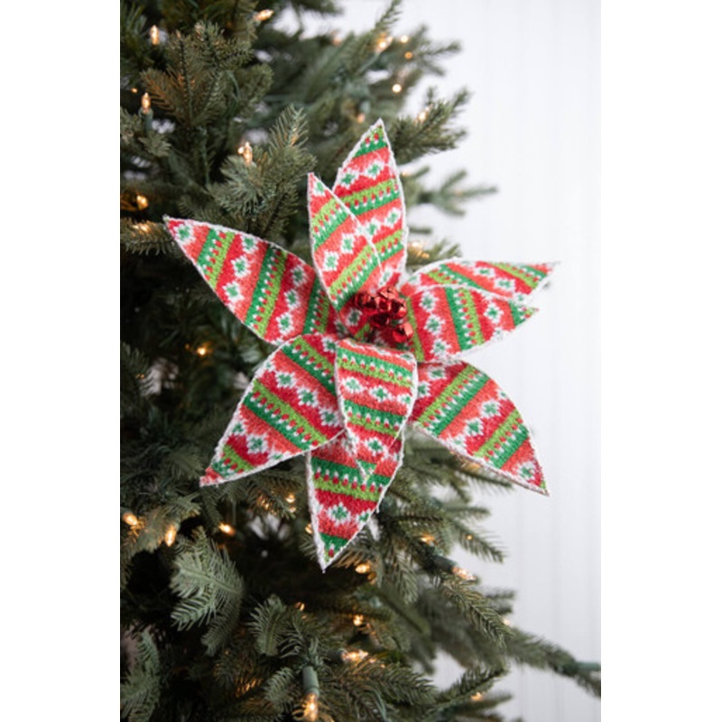 Discover the radiant warmth of our exclusive 22 Patterned Poinsettia Stem, with each petal dressed in a charming sweater pattern. The stunning display is brought together with a vibrant red jingle bell center. Brighten your red and green Christmas decorati