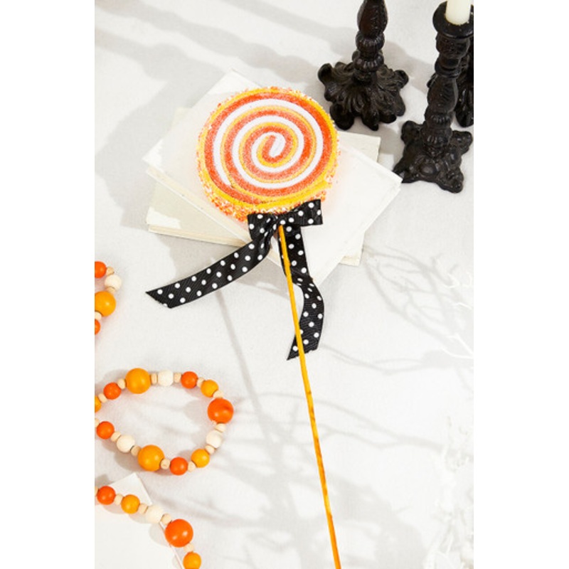 This charming Lollipop Spray in orange and white, accented with black polka dot ribbon is perfect for creating a fun and festive Halloween atmosphere in your home. Ideal for trees, wreaths, centerpieces, or floral arrangements, it brings a whimsical and sp