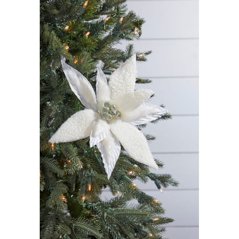 Bring warmth and charm to your Christmas tree, garlands, and wreaths with this beautifully textured poinsettia stem. Luxe ivory petals of wool and faux fur are complemented by a center of platinum berries. Use to create fullness and depth for picturesque holiday dcor. Featured in our Woodland Collection and tree bundle. This elegant poinsettia measures 12″ from “petal to petal.”