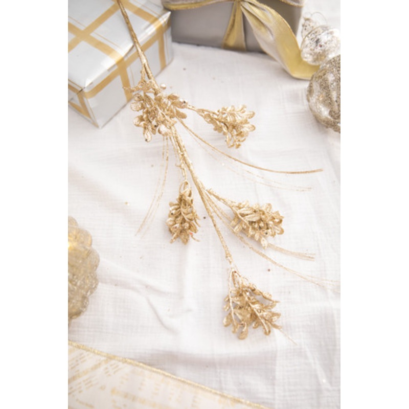 The soothing champagne tone of this shimmering boxwood grassy stem will blend with any elegant theme, adding a light and airy feel to balance your florals and ribbon. The wispy stems and delicate petals cascade out of your tree with its beautiful coating of glitter and sequins. Display in a vase to create a stunning holiday arrangement or spread throughout the body of your Natural Elegance Christmas tree.