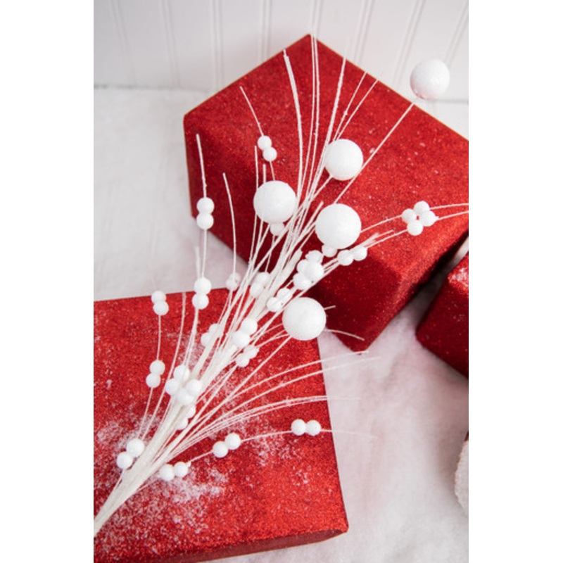 Add a whimsical, wintery feel to your Christmas tree this holiday season with this beautiful white glitter ball burst spray. The wispy tendrils of the pearly white stem have different sizes of balls scattered throughout, adding a unique texture to your holiday decor.