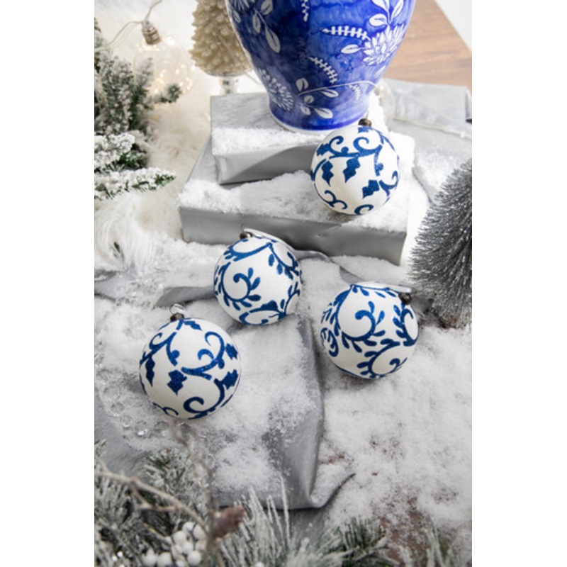 Add a touch of elegance to your holiday decor with these stunning 3.5 Chinoiserie Ball Ornaments. Crafted on a timeless white ball with fanciful blue glitter detail, these ornate pieces will add a touch of grace and charm to your home. Whether its hung on a tree, wreath, or mantel, these ornaments will bring the perfect finishing touch to any room. Comes in a set of four ornaments.