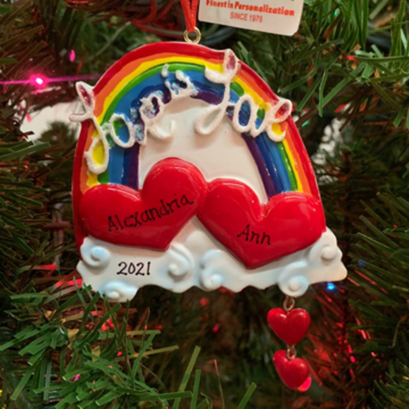 NEW for 2021 Celebrate LOVE with our personalized love is love ornament! This ornament features two hearts sitting on a cloud with a rainbow in the background and a few hearts dangling below! Get two names and the date written for a wonderful keepsake!Made