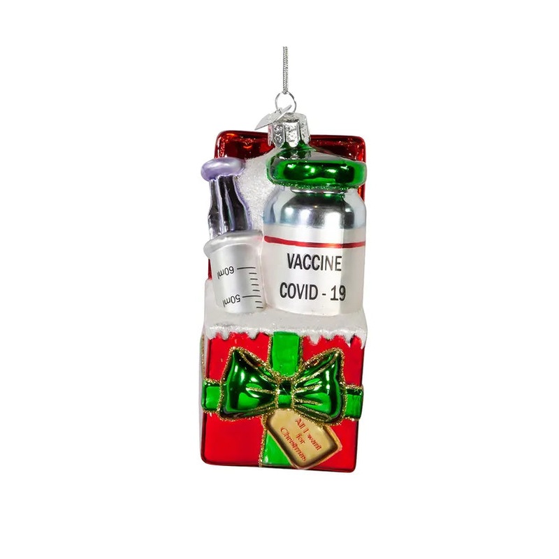 Kurt Adler’s Noble Gems glass COVID-19 Vaccine gift bag ornament is a festive addition to any holiday dcor or Christmas tree. It features a glass gift bag filled with Covid-19 vaccines.