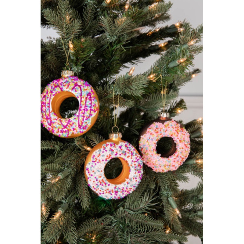 These delightful glass donut ornaments come in three delicious looks purple, pink, and drizzle. Add to your Santa's Sweet Shoppe inspired Christmas tree to add unmistakeable sweetness to your holiday decor.