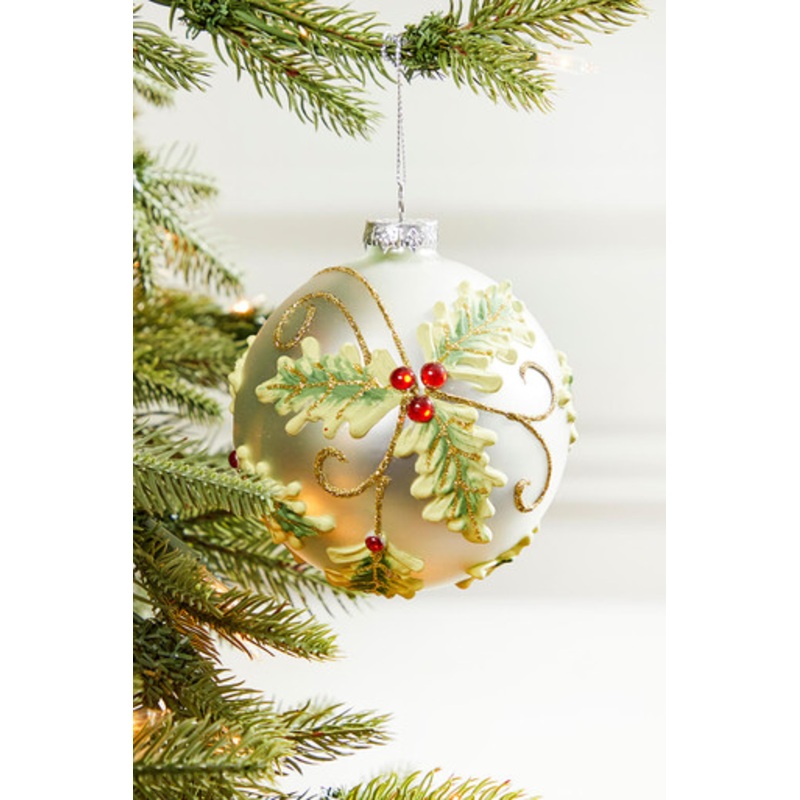 Discover how the 4" Glass Holly Jewel Ball Ornament with its ivory toned body, textured gold filigree detail, and festive red berry jewel accents can add sparkle and charm to your festive decor. Its unique design and high-quality construction make it a per