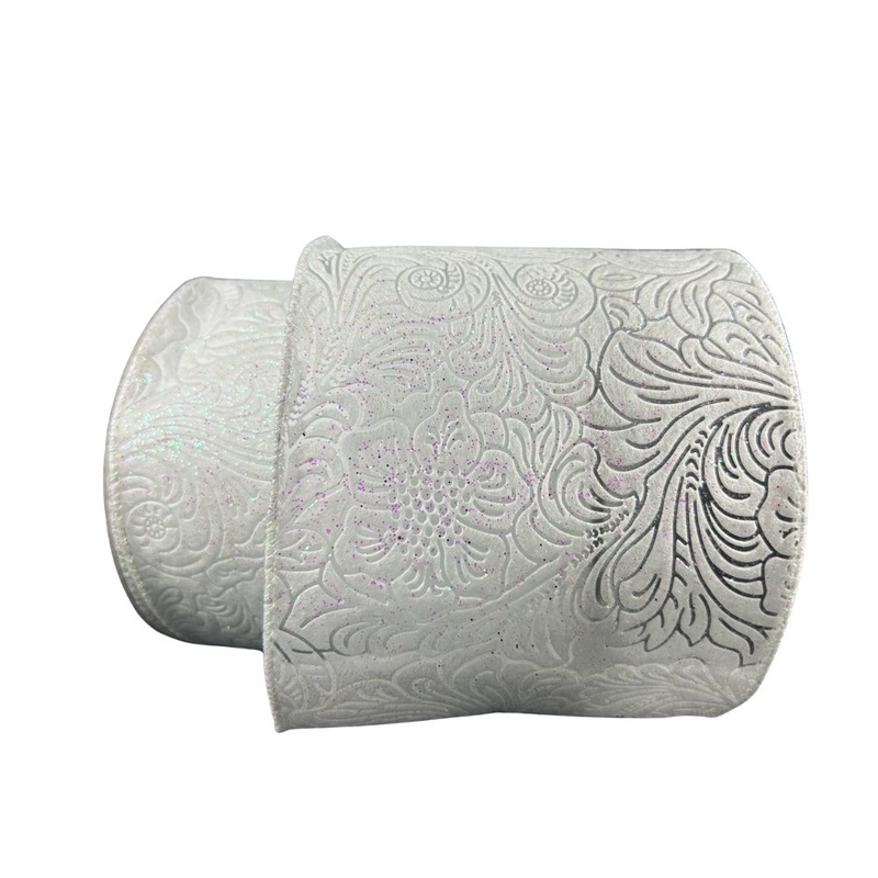 A 10 yard roll of 4" iridescent glitter white ribbon with a floral pattern embossed into it. The wired edges make this ribbon perfect for shaping into bows. This ribbon is thinner yet nice and sturdy and is semi-transparent in the places where the lines of