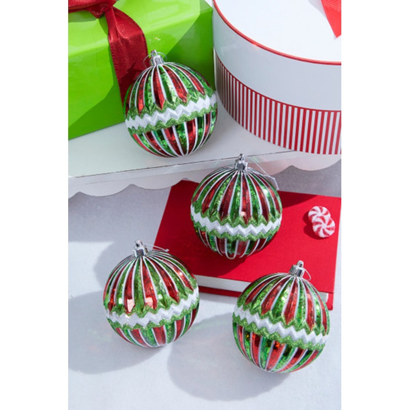 The 4" Red/Green/White Mercury Ridged With Zigzag Stripe Ball Ornaments provide shimmering elegance for the most fun themes! They are perfect for embellishing your Green Monster or North Pole Party Christmas tree or for adding complementary design to wreat