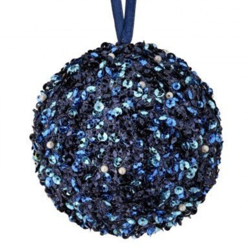 Midnight Blue 4" sequin ball ornament, covered in deep blue sequins, beads, and glitter. Add these ornaments along with dark blue poinsettias and luxurious ribbon to your Christmas trees, wreaths, garland, etc. for sparkly glam!