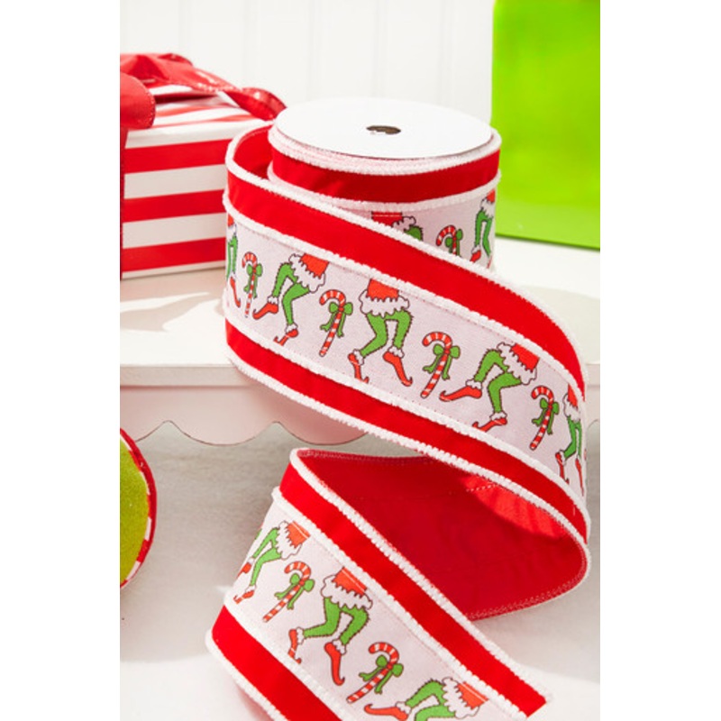 Add a whimsical touch to your holiday decorations with our wired 4" x 10 Yard Grinch Legs Ribbon. This unique ribbon features vibrant green and red, portraying the iconic legs of everyone's favorite Christmas character. Perfect for wrapping gifts, decorati