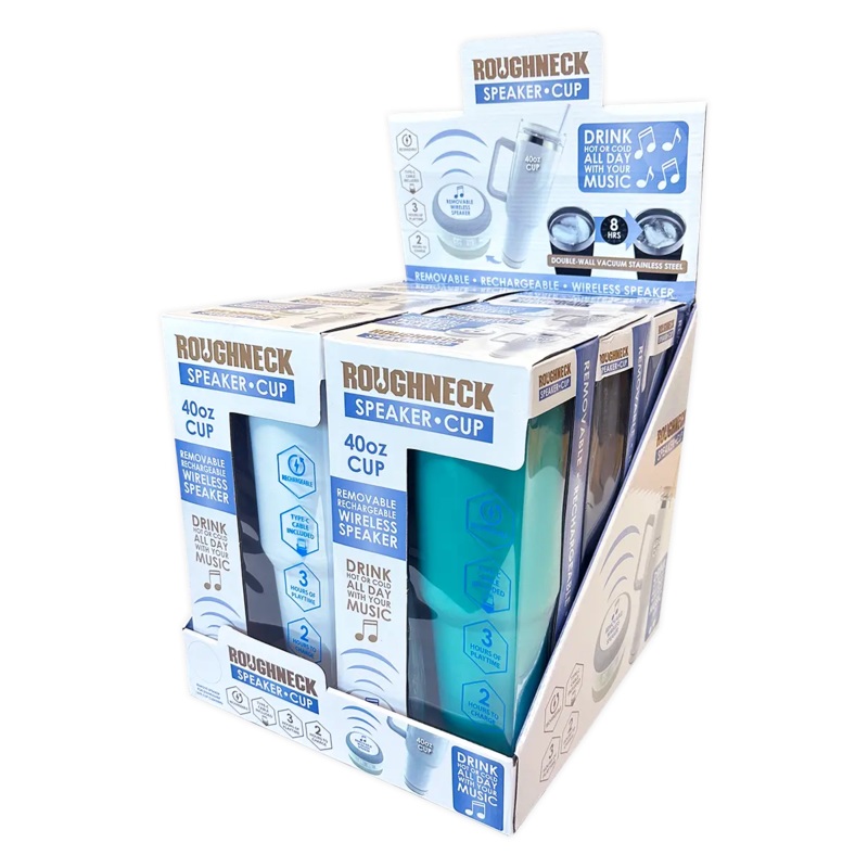 Stay hydrated and entertained with our 40oz Cup Speaker! This cup not only keeps your drinks hot or cold all day with its copper insulated double wall vacuum, but also comes with a removable wireless speaker. Enjoy 3 hours of playtime and easily recharge in just 2 hours with the included USB-C cable. The stainless-steel cup is BPA free, has a nonslip lid, and fits perfectly in a cup holder. Includes a variety of navy, grey, aqua, light blue, white and purple designs. Cheers to music and hydration in one!
