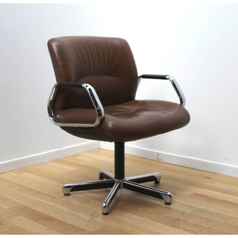 Vintage 454 Conference office chair, Steelcase Straford, 1980s. Chromed metal structure and seat upholstered in brown leather. Swivel chair. Seat height 42cm. Manufacturer Strafor Design Period 1980 to 1989 Production Period 1980 to 1989 Identifying Marks