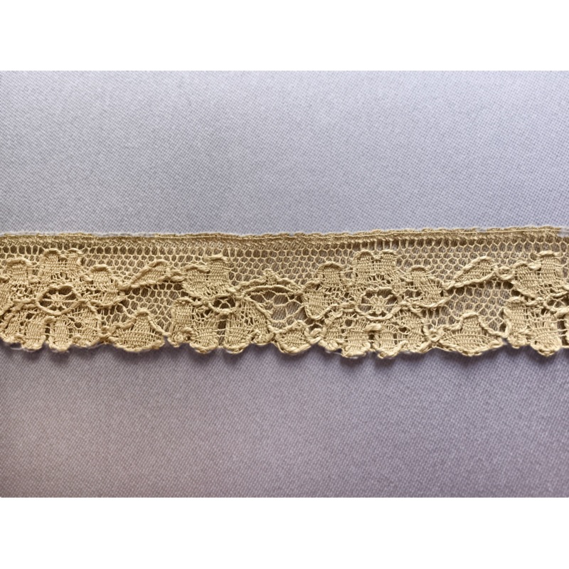 5/8" wide vintage edging lace trim, in antique beige and in a simple floral pattern with scallops along one edge. There may be some slight discoloring due to age. 100% cotton. Made in France.