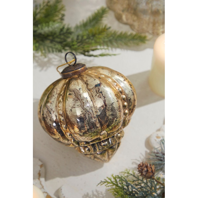 Unveil the charm of your white and gold Christmas decorations with our '5' Regal Antique Gold Mercury Glass Ornament! Embellished with a textured bead pattern and bathed in a gold and mercury-like wash, this ornament radiates an air of timeless elegance an