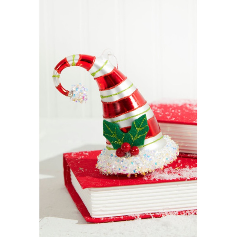 Deck your halls with our stunning 5" Santa Hat Glass Ornament! This red and green striped ornament has glitter details and a lot of whimsy! The iridescent fuzz accent adds texture and glimmer to the Santa hat, ensuring it catches every eye. Don't let your