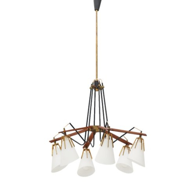 Italian-made chandelier produced in the 1950s.Stem, rosette and body of the lamp in brass and black painted metal.Arms in teak wood.Diffusers in white opaline glass surrounded by a brass crown.Good general condition, small signs of use.Dimensions: Diameter