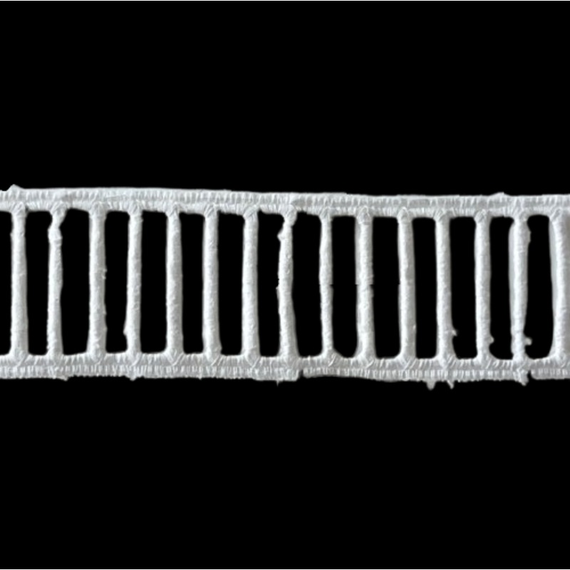 7/8" wide cloud white eyelet lace trim with simple faggoting. Finished edges. 100% cotton. Made in Switzerland.