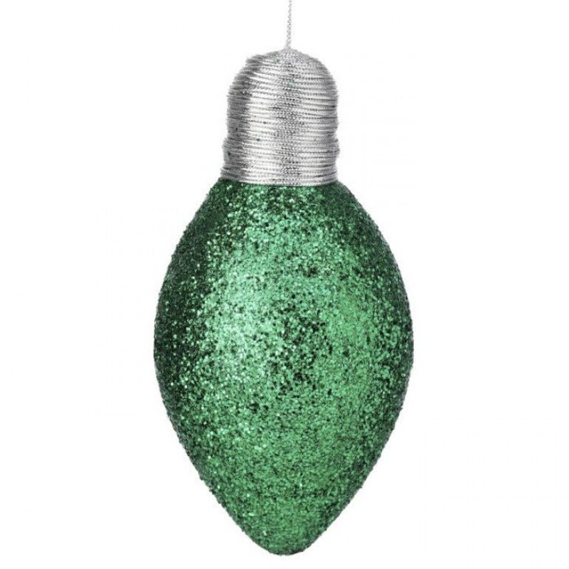7" Green Glitter Lightbulb ornament with silver hanger. Perfect addition to your Christmas tree, wreath, garland, or mantle!