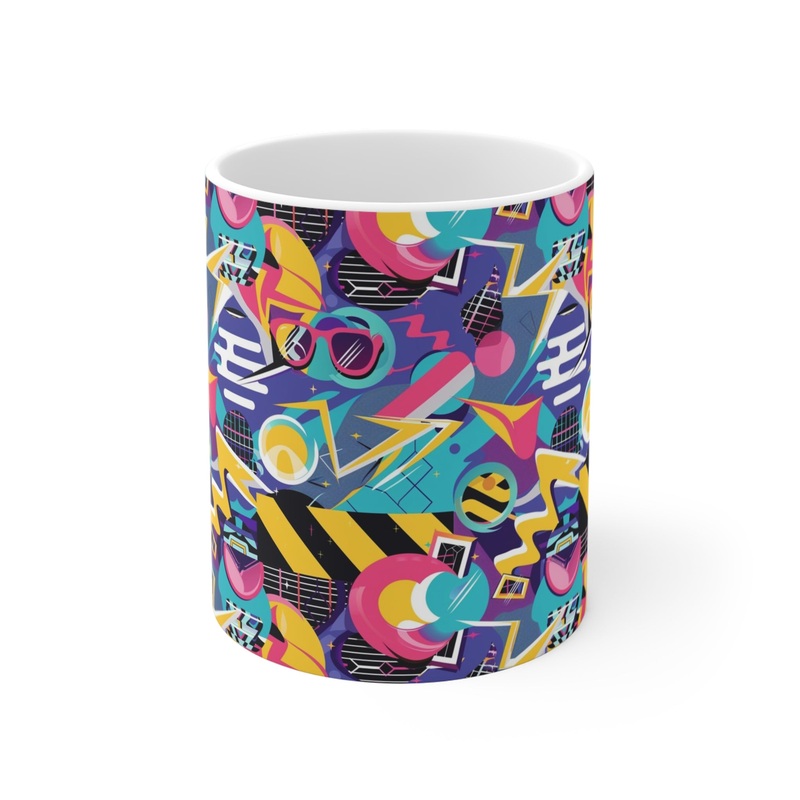 Keywords: 80s coffee mug, retro mug, nostalgia gift, vintage style mug, pop culture mug, ceramic coffee cup, 80s themed gift, unique coffee mug, colorful mug, funky home decor