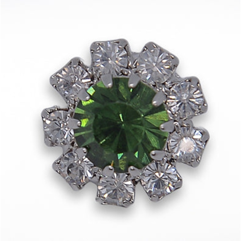 9/16" rhinestone button with a larger green center surrounded by smaller clear rhinestones. Metel shank backing. Made in Switzerland.